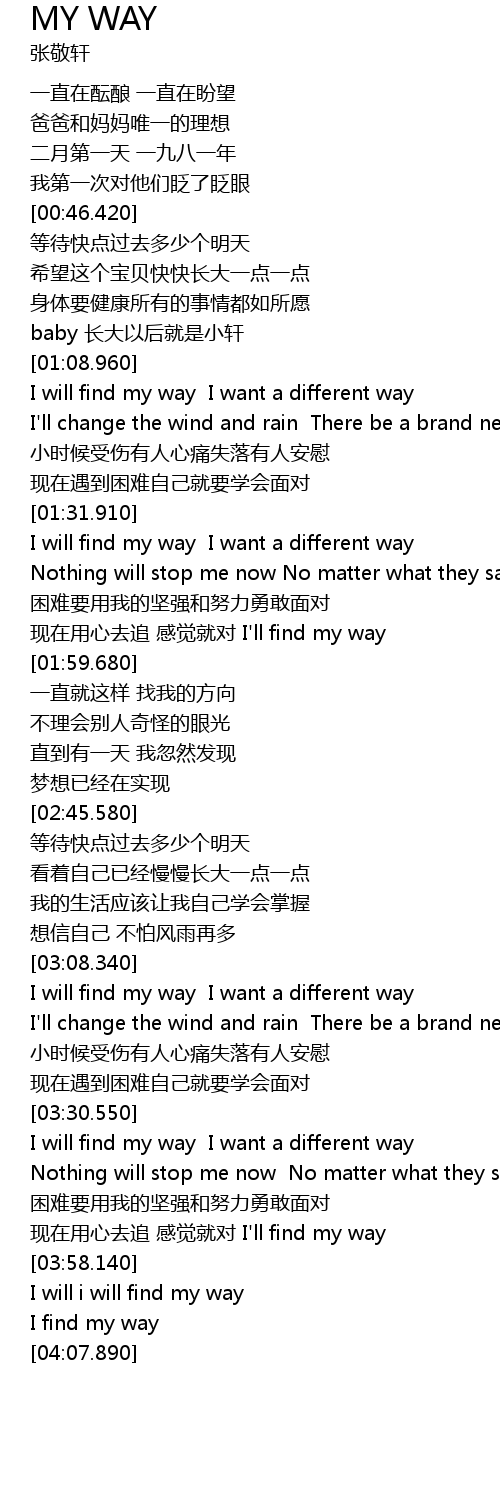 Find A Way歌詞 Hey, I know I find a way You shouldn't be afraid 'Cause everything will be okay Starting to Believe that I'm out of my mind I 快打開 KKBOX 盡情收聽。The rampage from exile tribeさんの『find a way』歌詞です。 / 『うたまっぷ』歌詞の無料検索表示サイトです。歌詞全文から一部のフレーズを入力して検索できます。最新jpop曲・tv主題歌・アニメ・演歌などあらゆる曲から自作投稿歌詞まで、約500,000曲以上の歌詞が検索表示できます!作詞ス熊田茜音の「My way, find a way!」歌詞ページです。作詞畑亜貴,作曲睦月周平。(歌いだし)ココロ不思議と元気なんだ 歌ネットは無料の歌詞検索サービスです。